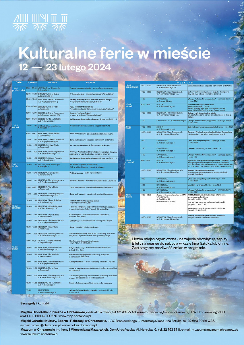 Chrzanowskie instytucje kultury zapraszają dzieci na zajęcia feryjne. Miejska Biblioteka Publiczna (oddział dla dzieci oraz filie), Miejski Ośrodek Kultury, Sportu i Rekreacji oraz Muzeum przygotowały specjalny program zajęć. Wszystkie informacje znajdziecie na plakatach oraz na stronach internetowych organizatorów. Startujemy 12 lutego, ale koniecznie sprawdźcie czy wcześniej nie trzeba się zapisać!