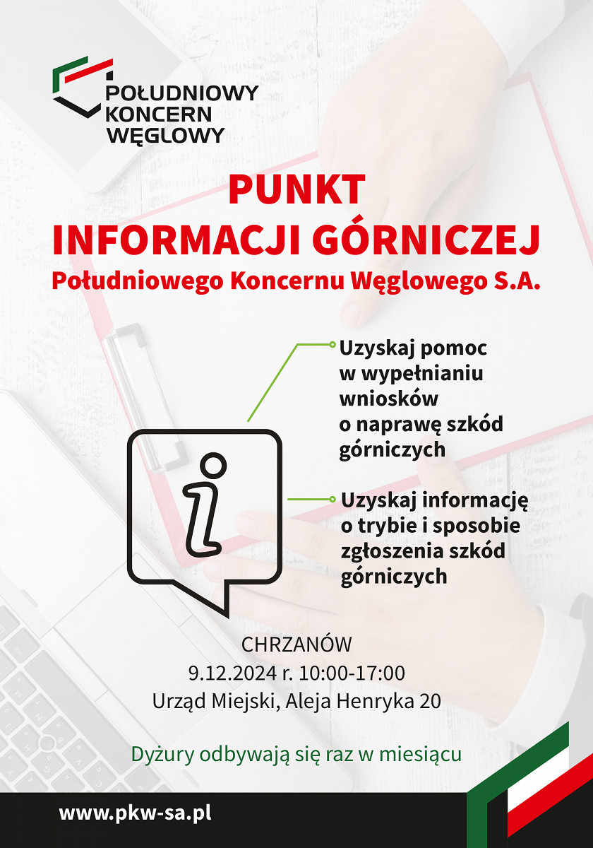 Południowy Koncern Węglowy S.A. zaprasza do Punktu Informacji Górniczej, który mieści się w Urzędzie Miejskim w Chrzanowie. Uzyskaj fachową pomoc w wypełnianiu wniosków o naprawę szkód górniczych oraz dowiedz się, jak prawidłowo zgłaszać szkody górnicze.