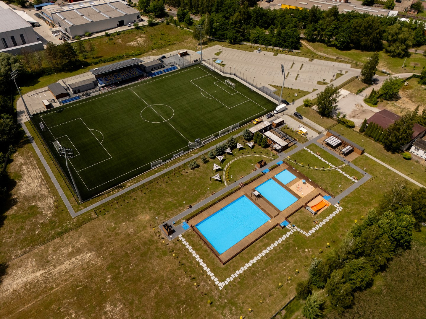 Baseny to nie wszystko. Miłośników gry w piłkę nożną ucieszy wiadomość, że tuż obok basenów powstał pierwszy w powiecie profesjonalny stadion piłkarski z oświetleniem, zadaszonymi trybunami oraz pełnym zapleczem. Stadion spełnia wszystkie wymagania Polskiego Związku Piłki Nożnej dla rozgrywek IV ligi. Boisko o rozmiarze 105 metrów długości i 68 metrów szerokości zostanie pokryte sztuczną murawą. Jest także oświetlone, a nad zadaszonymi trybunami została zamontowana instalacja fotowoltaiczna.