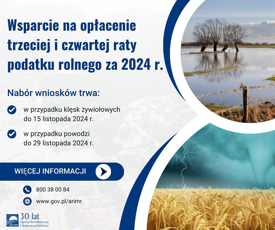 Szeroki wachlarz działań pomocowych, o których wspomniał prezes Agencji, obejmuje oprócz realizowanych zgodnie z harmonogramem, np. w ramach Planu Strategicznego dla Wspólnej Polityki Rolnej na lata 2023-2027, również te uruchomione ad hoc i finansowane z budżetu krajowego, m.in. standardową pomoc „klęskową” do powierzchni upraw dla rolników, którzy w 2024 r. ponieśli straty spowodowane niekorzystnymi zjawiskami atmosferycznymi (nabór trwa do 15 listopada) oraz wsparcie na opłacenie III i IV raty podatku za 2024 r. dla poszkodowanych w 2024 r. w wyniku wystąpienia niekorzystnych zjawisk atmosferycznych – gradu, deszczu nawalnego, huraganu, przymrozków (ten nabór również kończy się w połowie listopada).