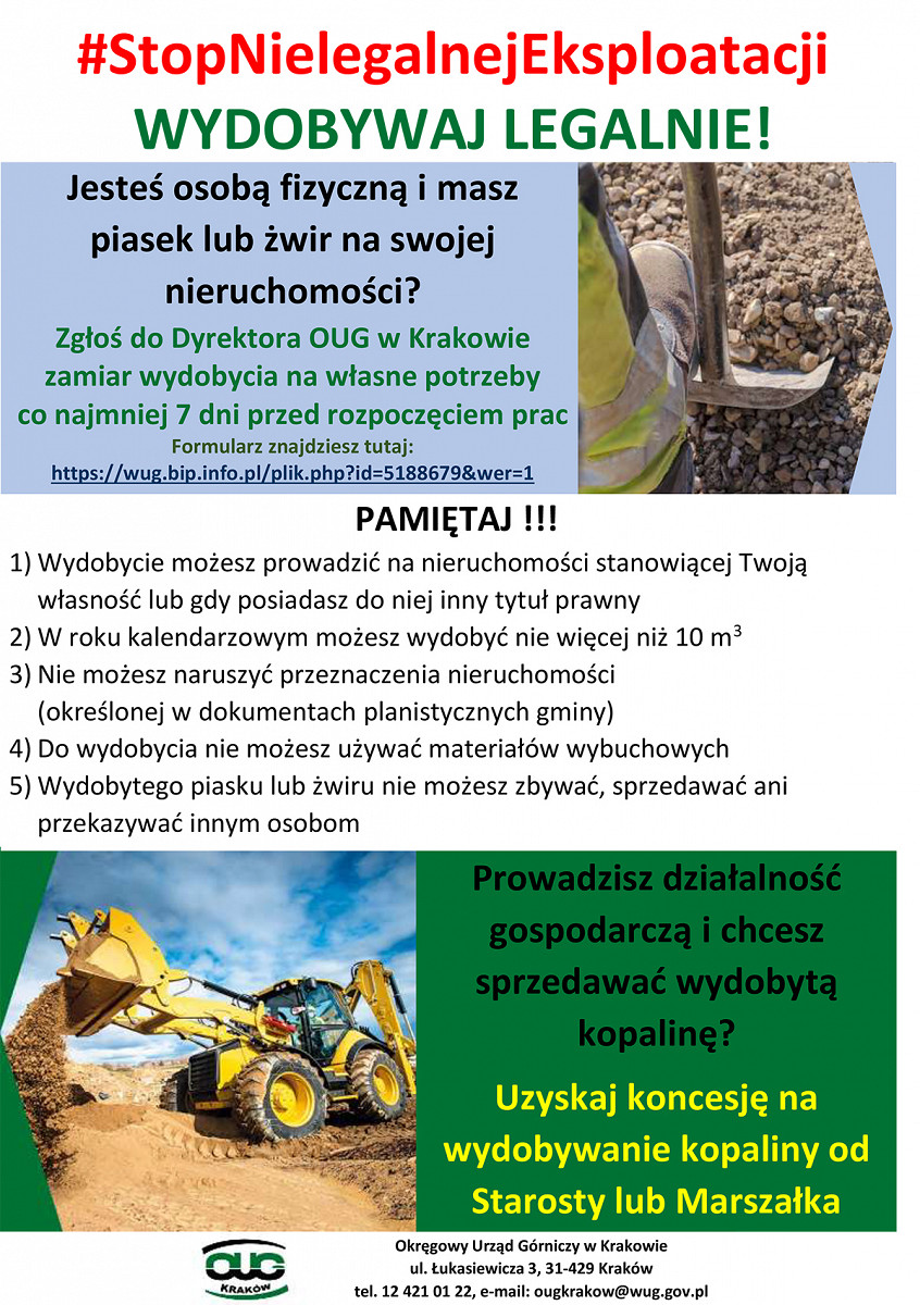 Okręgowy Urząd Górniczy w Krakowie prowadzi kampanię informacyjną #StopNielegalnejEksploatacji. Kampania ma na celu budowanie świadomości społecznej w zakresie możliwości i warunków wydobywania kopalin w celu zaspokajania potrzeb własnych i wyeliminowania procederu prowadzenia eksploatacji bez koncesji.