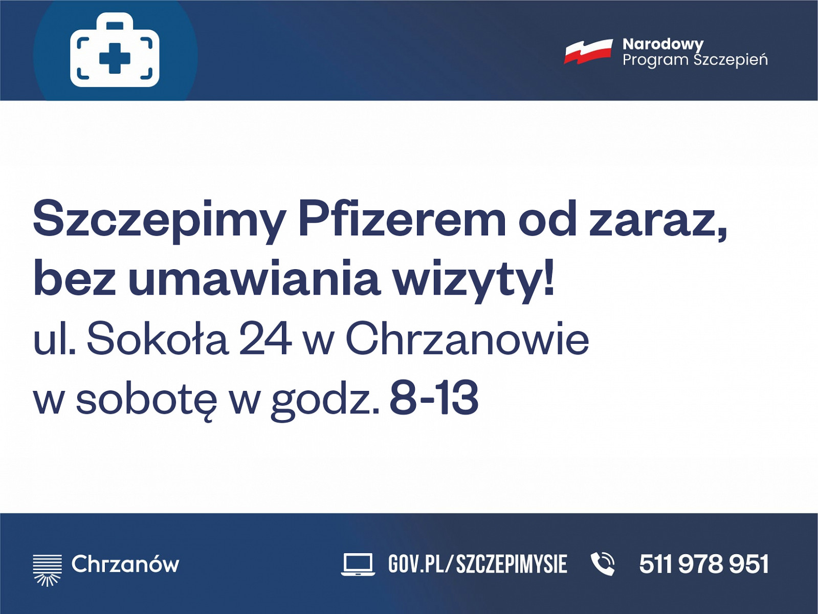 W punkcie szczepień przy ul. Sokoła 24 szczepimy "z ulicy" szczepionką firmy Pfizer. W najbliższą sobotę (19 czerwca) będzie znowu możliwość skorzystania ze szczepienia. W sobotę punkt czynny będzie w godzinach 8-13.